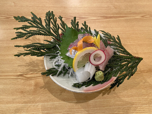 マイカ、サヨリ、ヒラメ、カワハギの昆布〆、マダコ、青物(なんだったかな)、真鯛の湯霜造り、です。