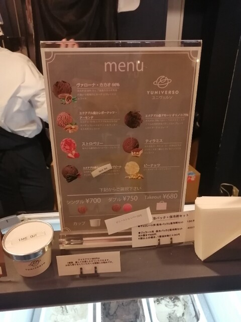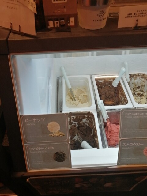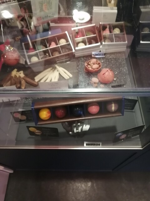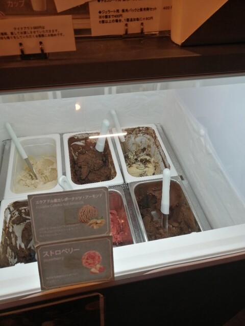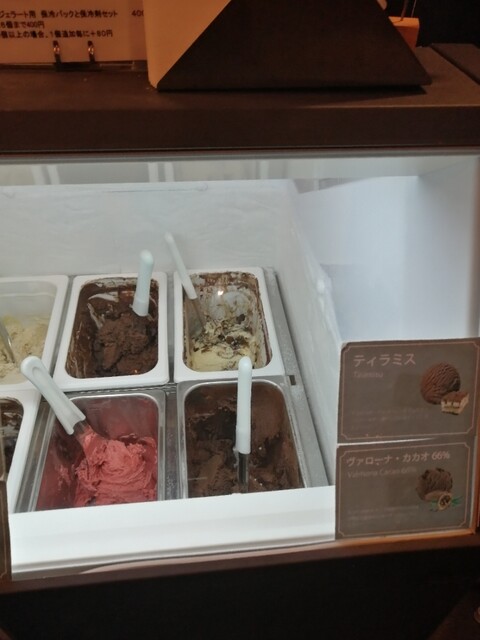 外看板にはクレープメニュー、店内に入るとジェラートのショーケース、そしてテイクアウト用のチョコレートなどが並んでいます✨