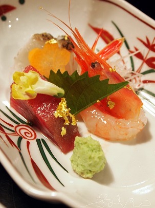 すずき焼き霜、本鮪赤身、甘海老、金魚草、紅葉人参、本山葵、旨醤油