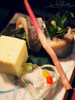 梭子魚幽庵焼、エリンギ、浅葱、芋カステラ、白身魚煮こごり、酢取り葉地神