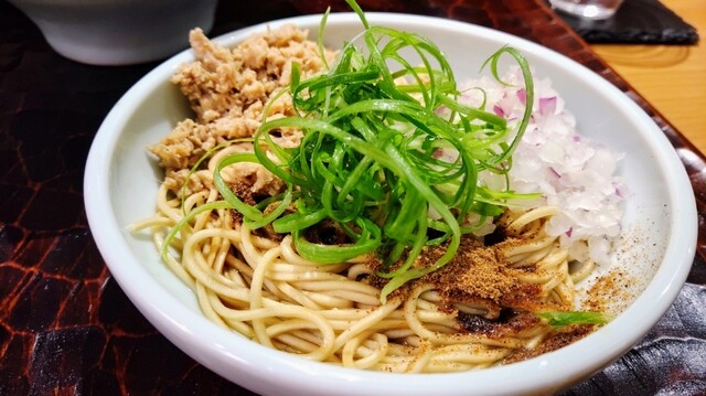 トッピングに、魚粉・九条葱・刻み玉葱・鴨そぼろ。