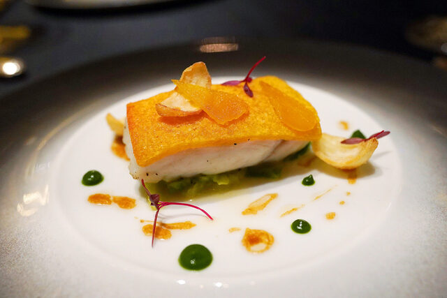 ふっくらと焼き上げた平目の上にはサクサクのパン粉とチーズと唐墨の組み合わせ。
