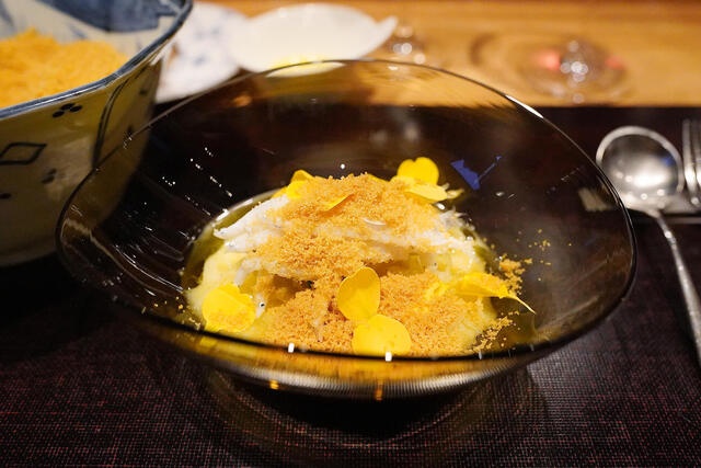 林檎の食感のアクセントと甘みがびっくりするほど自然と溶け込んでおり、松葉蟹の旨みとも抜群に合います。絶品!