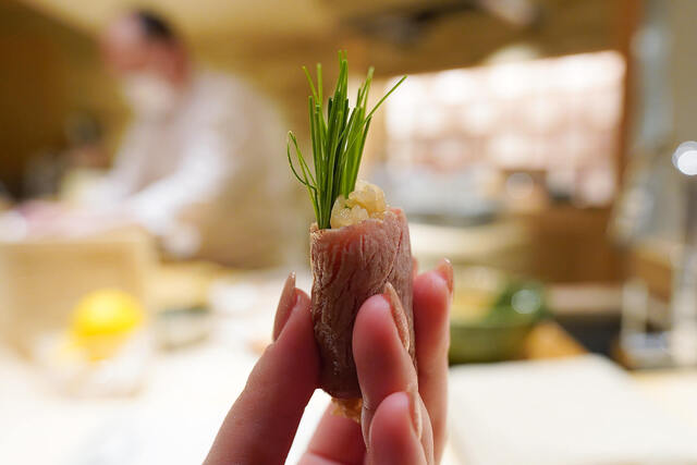トロを炙って芽葱とシャリに巻いて。