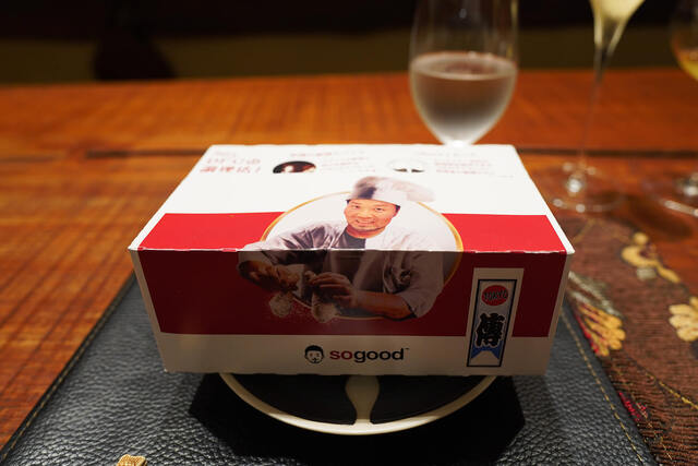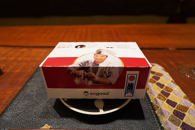 遊び心溢れるケンタッキーを模した箱には店主の長谷川シェフ。