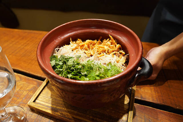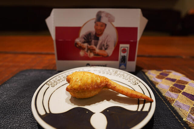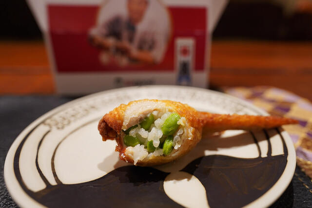 パリッとジューシーな手羽の中には、福岡の新八女茶と唐辛子のおこわ。