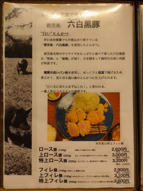 南口のほぼ駅前の建物の地下1階。カウンター席に案内される。クラフトビールのブルックリンラガーと水曜日のネコを注文。とんかつは店主の実家が育てている鹿児島六白黒豚を使用していて、低温でゆっくりと揚げる白い衣のとんかつ。特上ロース膳(200g)(3200円・税込3520円)、特上フィレ膳(200g)(3600円・税込3960円)を頼むことにして、とんかつが揚がるまでの時間潰しに、単品メニューの和牛と銘柄豚のメンチカツ(440円)を1つ、国産鶏モモ肉の唐揚げ(180円)も2つ頼んだ。豚汁としじみ汁を選ぶように言われて2人とも豚汁で。そしてキャベツを先出しで出してもらった。