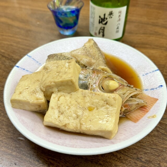 のどぐろの煮付けは豆腐と一緒に甘めの味付けでふっくら煮てあり絶品。煮ることで身の脂が落ちるので刺身や焼きよりもさっぱりいただける。逆に焼き魚はジューシィな脂の美味しさを堪能できる。レモンとわさびの葉の漬物が付け合わせ。