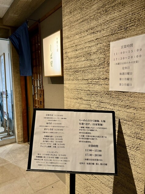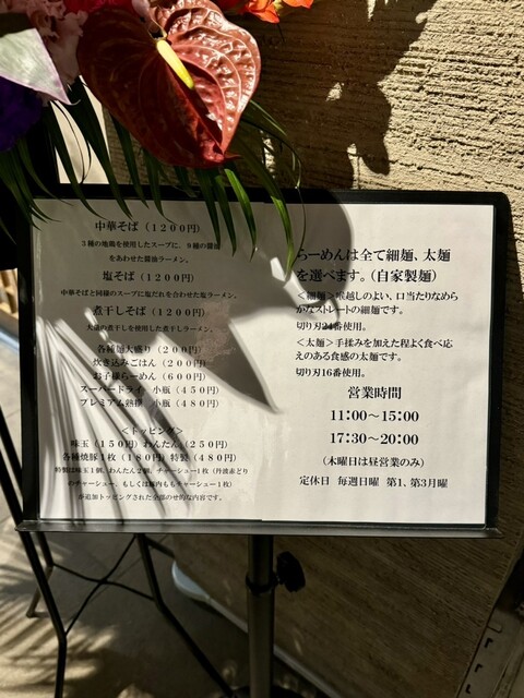メニューは中華そば(1200円)、塩そば(1200円)、煮干しそば(1200円)の三本柱で、味玉やわんたん、特製など各種トッピング付きのラインナップ。麺は細麺(切り刃24番使用)と太麺(切り刃16番使用)が選べる。仙川時代は太麺は夜限定だったが、今回の移転リニューアルに伴い終日選択可能になっている。