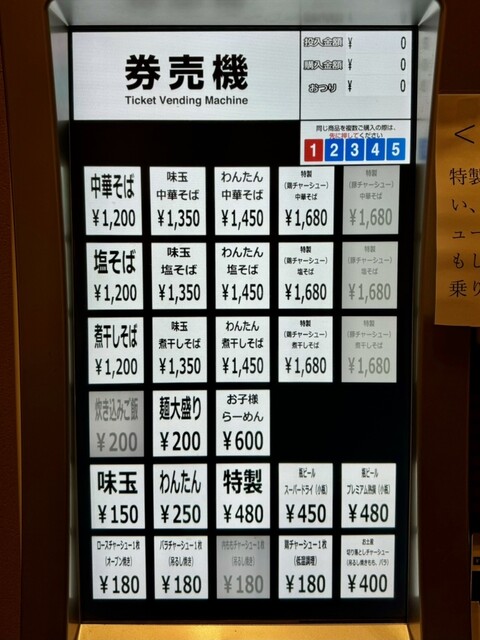 店内入口に券売機があり、メニューは中華そば(1200円)、塩そば(1200円)、煮干しそば(1200円)の三本柱で、味玉やわんたん、特製など各種トッピング付きのラインナップ。麺は細麺(切り刃24番使用)と太麺(切り刃16番使用)が選べる。
