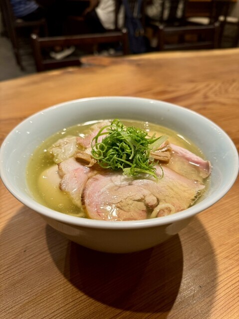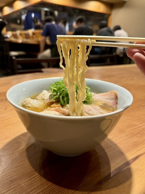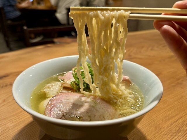 3種類の地鶏を使ったスープは清湯(チンタン)と白湯(パイタン)の中間ぐらいの薄濁りで、鶏の旨味をしっかり抽出している。さらに魚介出汁を効かせた塩ダレを合わせて、中華そば(醤油)とはまたひと味違った重層的な旨味。