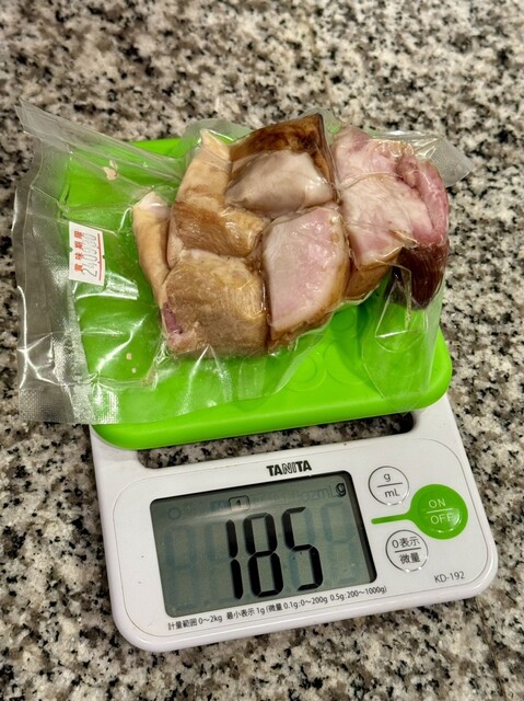 お持ち帰りの「お土産切り落としチャーシュー」(400円)も購入し、自宅に帰ってからビールのおつまみに。豚チャーシューの端っこの切り落としが真空パックになっている。一袋約180gもあって食べ応え抜群。