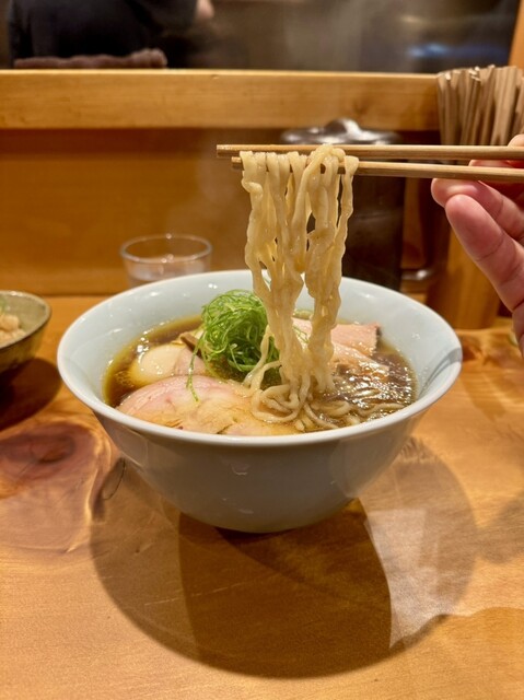移転後4回目の訪問で、醤油(細麺)、塩(太麺)、煮干し(太麺)と一巡したので、醤油の太麺をチョイス。塩も煮干しも都内トップクラスの美味しさだけど、やっぱり醤油は別格だ。醤油のコクと深み、鶏の旨味、香り、全てが至高。