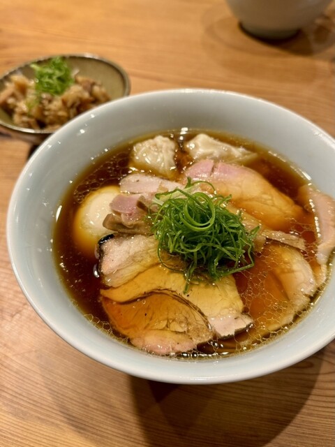 特製(+480円)は基本のラーメンには入らない豚ももチャーシュー、もしくは鶏チャーシュー1枚とワンタン2個、味玉追加。ワンタンは餡を丸く包んだてるてる坊主型で、餡はしっかり肉の旨味があり、ツルツルの皮の舌触りも絶妙。