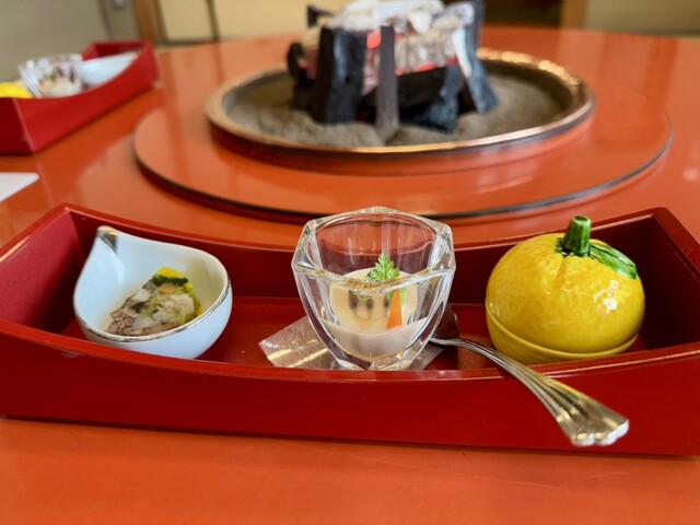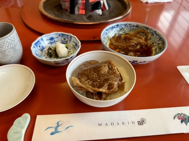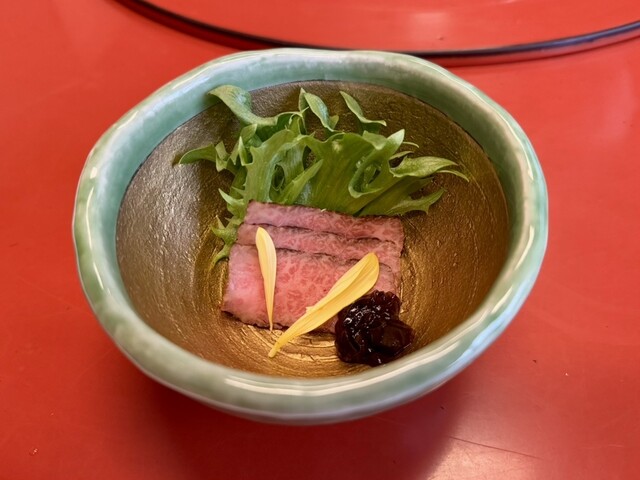 最初にコースの前菜となる「かはり炙り焼」が提供。炙り焼は松阪牛のローストビーフで、赤ワインのジュレが添えられている。和田金で提供する松阪牛は全て雌牛の未経産となり、一般的に流通している雄牛(去勢牛)と比べると、脂の融点が低いのが特徴。口に含んだ瞬間に上質の脂がとろけていくのを感じる。