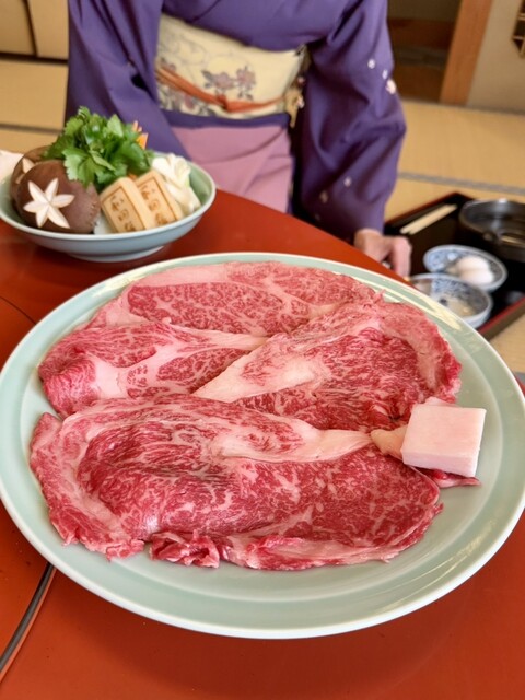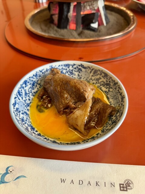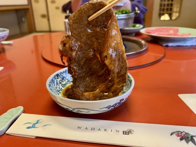 味付けは上白糖と秘伝のたまり醤油、薄味の昆布出汁のみ。酒やみりんは使わず、肉そのものの旨みを引き出していく。仲居さんがベストな食べ頃のタイミングの見極めて鍋から肉を上げて、朝採れの卵をといた器にお肉を入れてもらい味わう。
