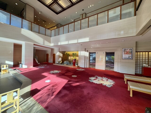 1階の豪華なエントランスには大きな吹き抜け、足元には赤い絨毯が広がっており、まるで高級旅館のような雰囲気。2階から5階に40の部屋があり、全て個室のお座敷となっている。仲居さんが丁寧に出迎えてくれ、エレベーターを上り、個室まで案内してくれる。