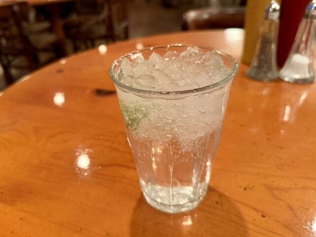 ハンバーガーには炭酸ドリンクがぴったり。とはいえ、コーラやビールだと無難すぎるので、せっかくだからカクテルのジントニックをチョイス。ジンはイギリスの代表的なブランド「タンカレー(Tanqueray)」で瓶ごと冷蔵庫で冷やしてあるので、冷たい炭酸水を注いでも炭酸が抜けにくく、心地よいシュワシュワ感。