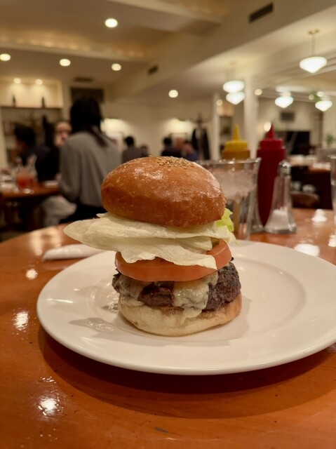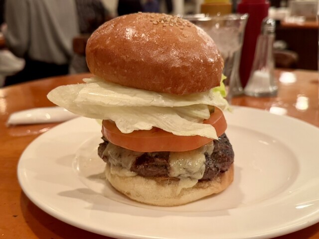 看板メニューの「マッシュルームチーズバーガー」はフレッシュマッシュルームを赤ワインで煮込んでからガーリックとバターで炒め、サワークリームを和えてグリュイエールチーズと一緒にパティ(ハンバーグ)に乗せて焼いた一皿。パンズとパティ、野菜がお皿に美しく盛られて、まさしく「レストラン」のハンバーガーというスタイル。