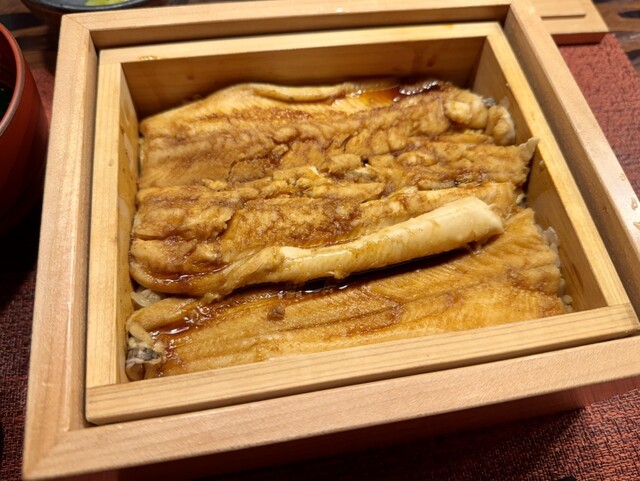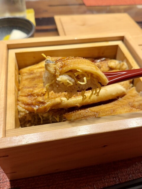 せいろ蒸しは穴子のサイズによって中(3800円)と大(4300円)がある。せっかくなので大をチョイス。白木の重箱の蓋を開けると超大ぶりな特大穴子が折りたたまれてギュウギュウと敷き詰められている。こんなに大きな穴子は初めてだ。これだけ身は厚いのにスプーンで簡単にほぐれるほどふっくらと柔らかく、口に運ぶととろけるような食感。ジューシーな脂もしっかりのっているが、しつこさはなく極上の脂質。専用の檜(ヒノキ)の蒸篭(せいろ)も香りが良く、穴子やタレの香りと合わさって立ち上る香りの絶妙。