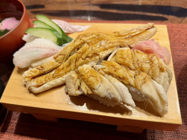 ふっくら柔らかい煮穴子とぷりぷりの弾力ある歯応えと繊細な甘みが堪能できる生穴子の両方を食べ比べできるにぎり寿司。生の穴子は噛めば噛むほど上品な甘みと穴子特有の香りも感じられる。シャリは対馬北部の自然環境豊かな佐護地区の水田で元気に栽培された佐護米を使用しており、ふっくらとツヤのある美味しいお米。定食セットは先付のあなごの煮凝りとあな巻き(白焼きの玉子巻き)、あなざく(穴子ときゅうり、わかめの酢の物)、あなご出汁のお吸い物と茶碗蒸し、食後の甘味、コーヒー付き。