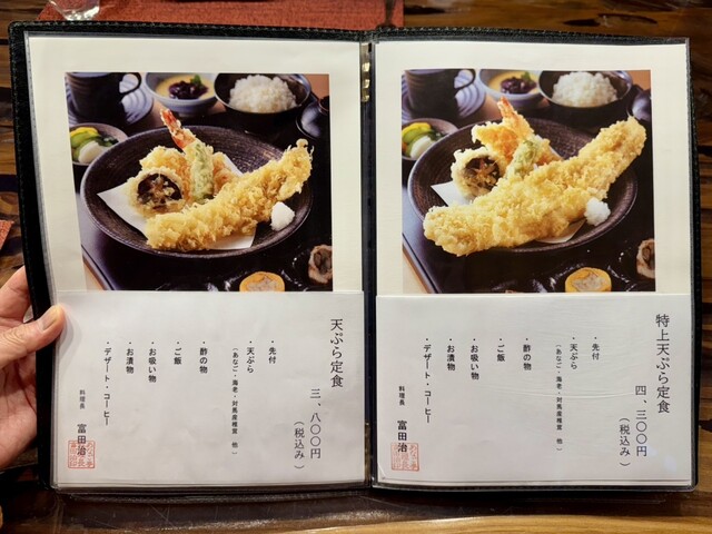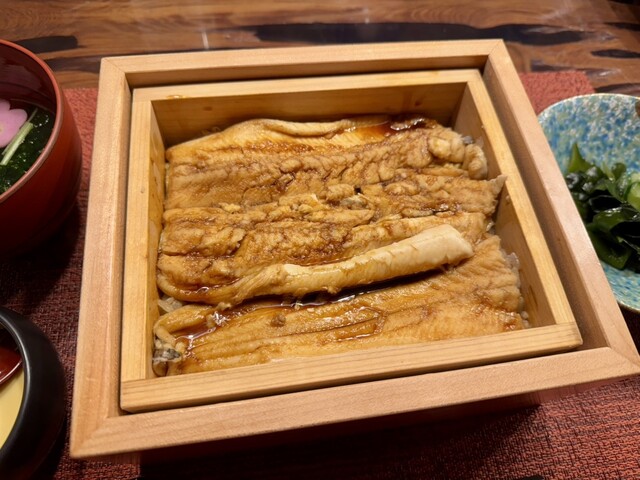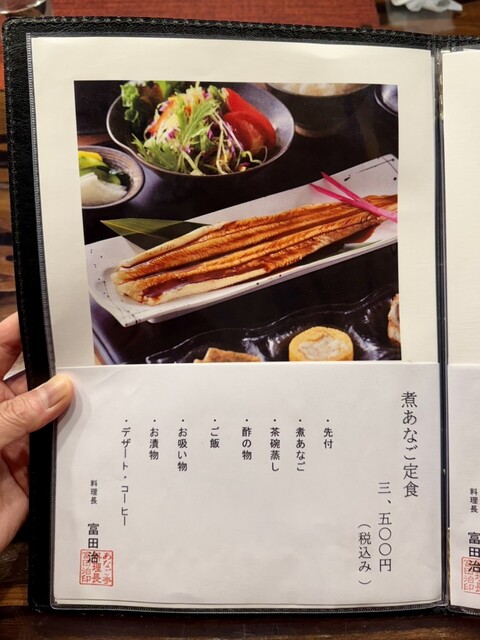 メニューは穴子のせいろ蒸しや天ぷら、寿司、白焼き、煮あなご、あなごカツなどさまざまな穴子料理が楽しめる。先付けの小鉢と茶碗蒸し、酢の物、お吸い物、デザートなどがセットになった定食形式で価格帯は3000円~4000円ほど。