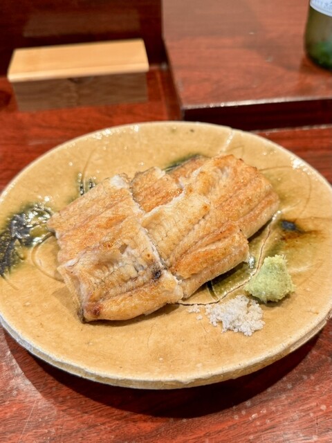 備長炭で焼く直前に串を使って鰻の身を何度も突き刺している。これにより余分な脂を抜くと同時に身の間にあるゼラチンを皮側に落とす事で、ぶよっとした食感や脂のくどさがなくなるそうだ。焼きあがった白焼きは身も皮目もカリッとクリスピーに焼き上がり香ばしさが格別。関東風のように蒸していないので、身はしっかりとした食感で、適度な脂感でふっくらとして本当に絶品。本わさびと塩でシンプルに味わうと鰻そのものの味わい、香りがダイレクトに堪能できる。