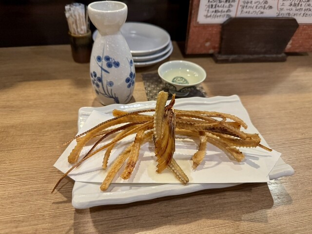 お酒のおつまみにぴったりの魚の骨せんべい。お店で捌いた色々な魚の骨をカリカリに揚げた一品。二度揚げして提供されるので、熱々なのもうれしい。
