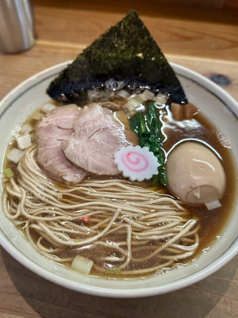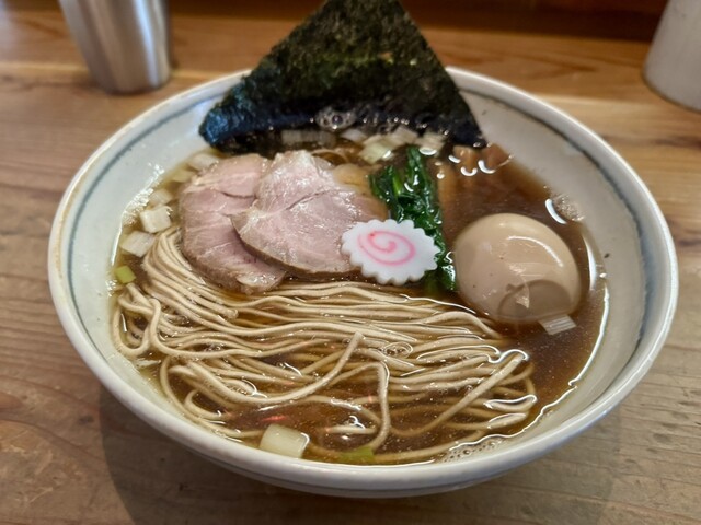 鶏ガラと豚肉を丁寧に炊き上げた動物系スープと、煮干し出汁の魚介スープを合わせた薄濁りのあるスープは、煮干しの風味がふんわりと香る上品で柔らかな口当たり。
