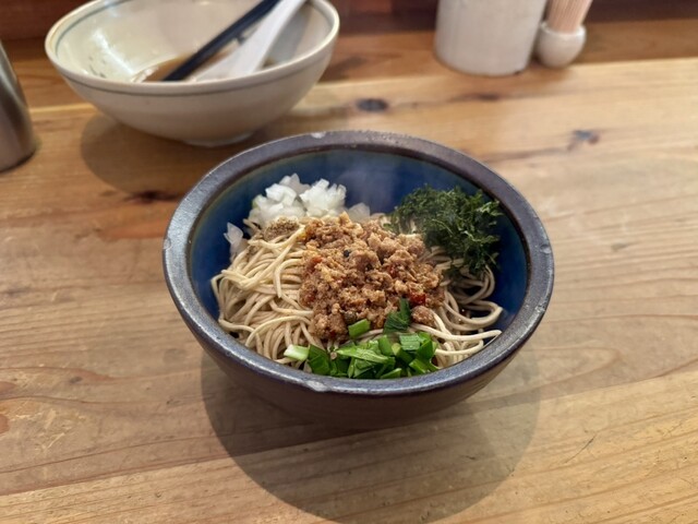 「和え玉」は替え玉にタレや薬味、具をトッピングした、そのまままぜそばのように食べられる味付き替え玉。ピリ辛の台湾ミンチ(挽肉)と花椒(ホアジャオ)、ニラ、ばら海苔、刻み玉ねぎがトッピング。台湾まぜそばというより汁なし担々麺に近いような味わい。コリコリ極細麺も病みつきになる美味しさ。
