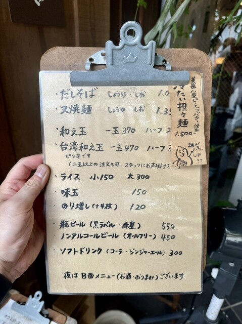 メニューはだしそば(1030円)と叉焼麺(1350円)でそれぞれしょうゆとしおが選べる。麺大盛りはないが、和え玉(味付き替え玉)やライスもあり、夜はお酒やおつまみなども提供している。