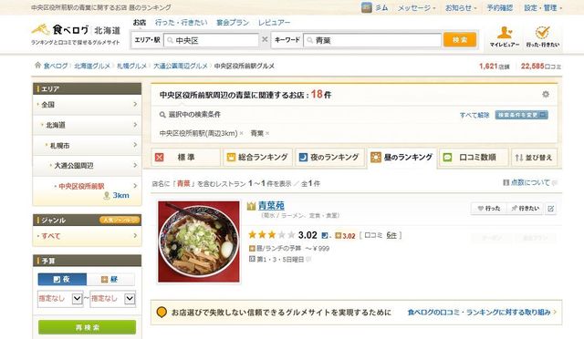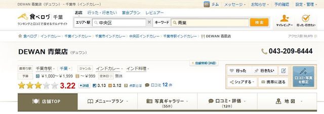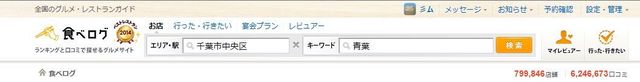 1.食べログトップページのエリア・駅欄に「千葉市中央区」、キーワード欄に「青葉」と入力し検索する。(画像1)