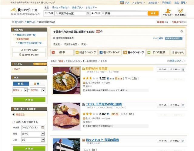 3.遷移した画面では、左上の表記が「食べログ|千葉」となっており、エリア・駅欄に初めから「中央区」と表示されている。その状態で、キーワード欄に「青葉」と追加入力して再度検索する。(画像3)