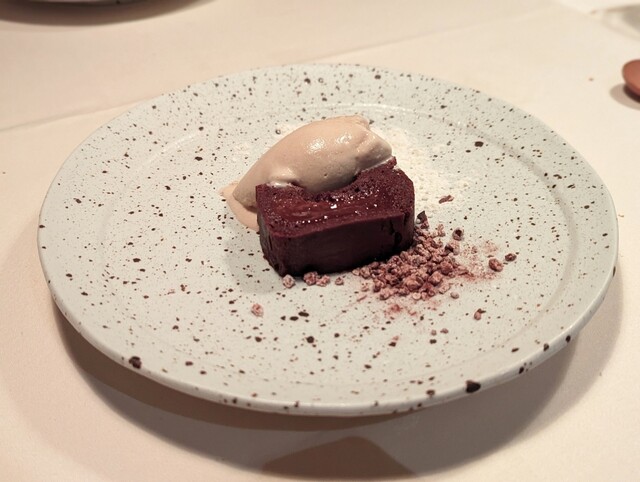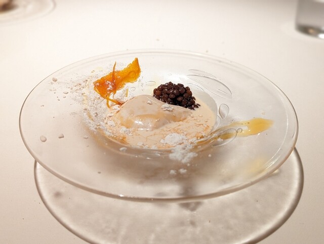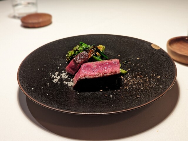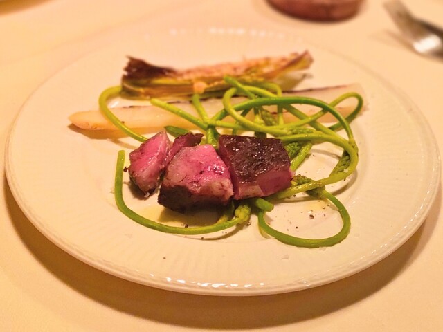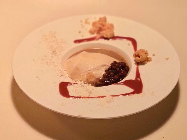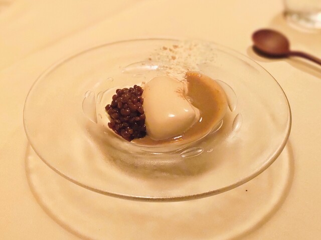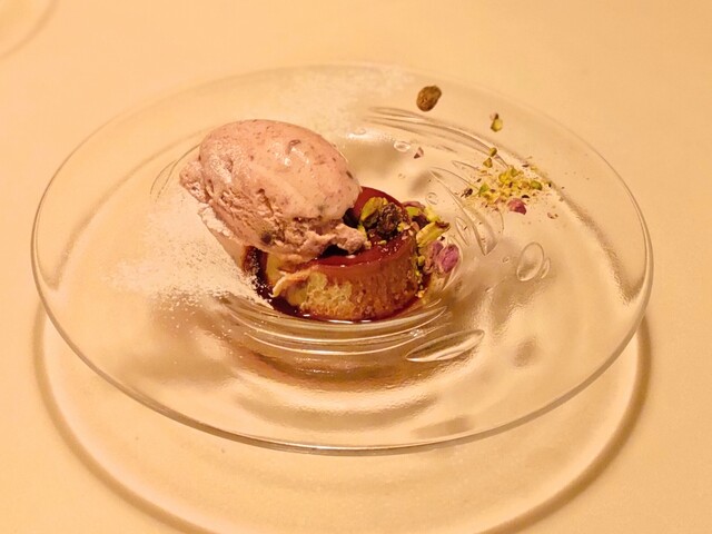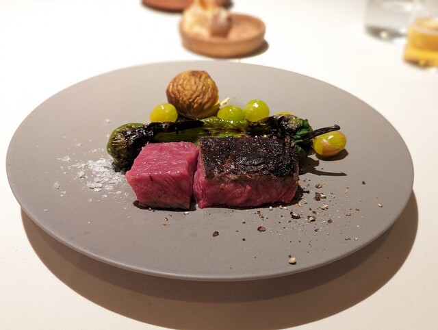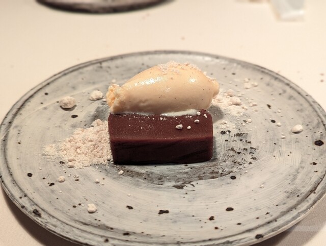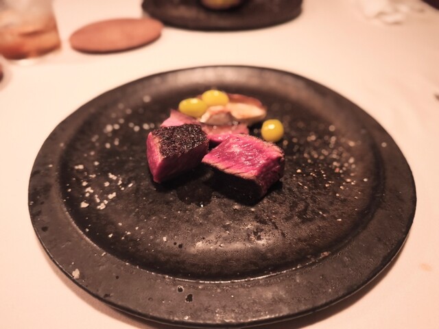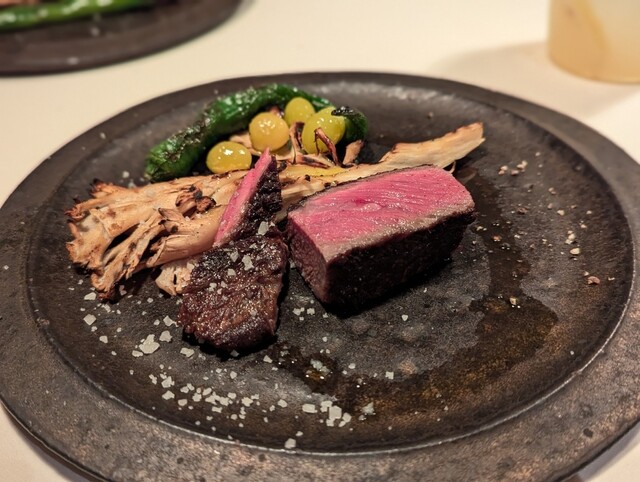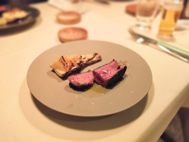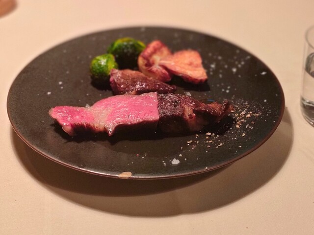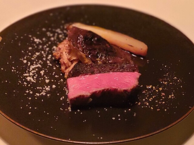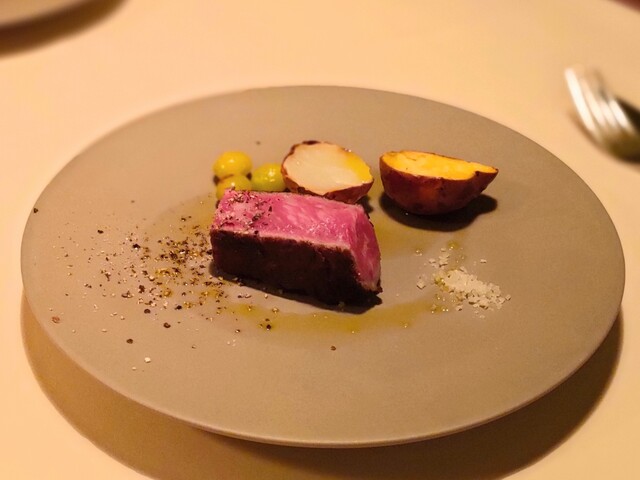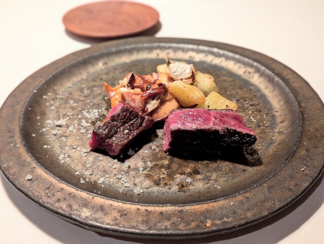 メインは赤牛のモモ。赤身しっかりながら、抜群の火入れで赤身部分はとろけるような感覚。付け合せの百合根もサクサクと心地よい調理。素材に力があるとソースは不要で全く問題ないですね。