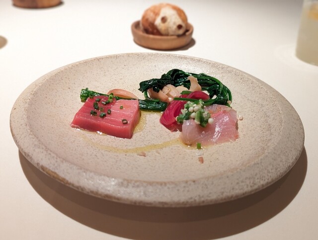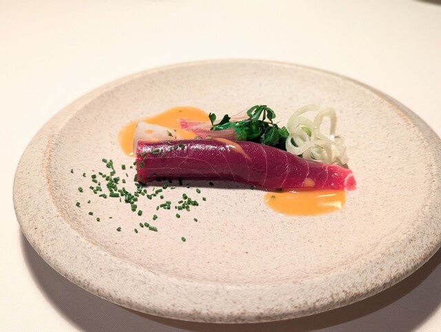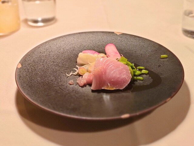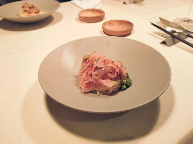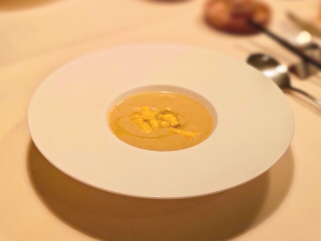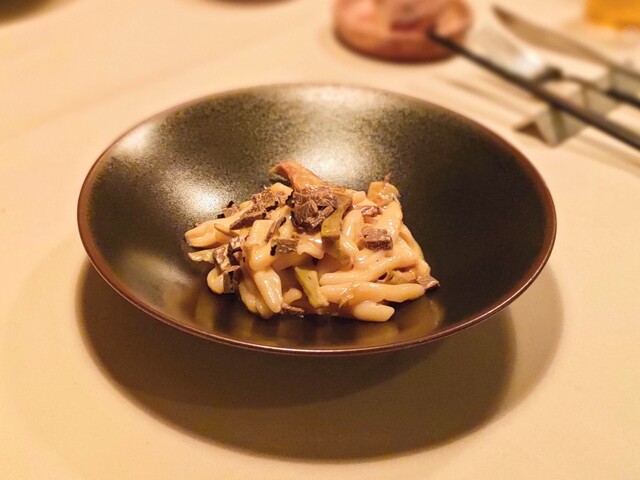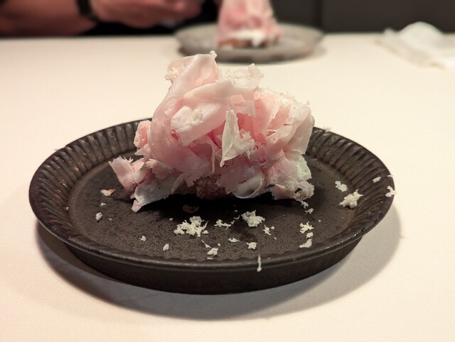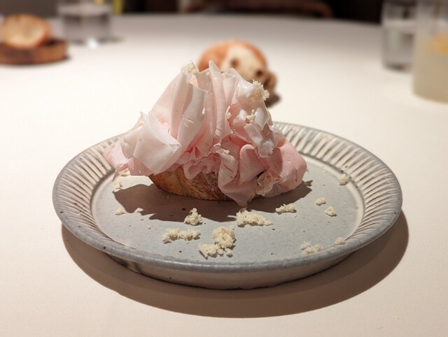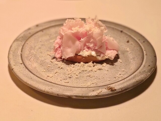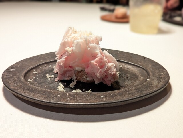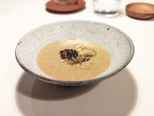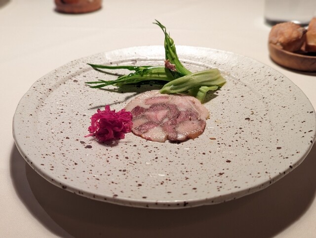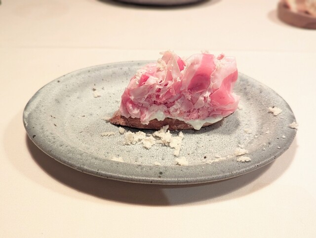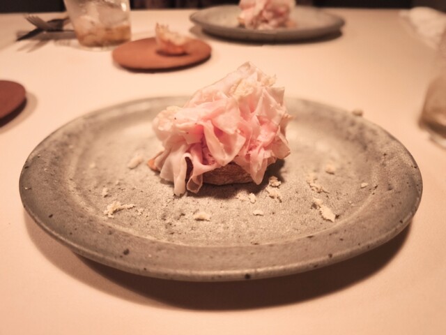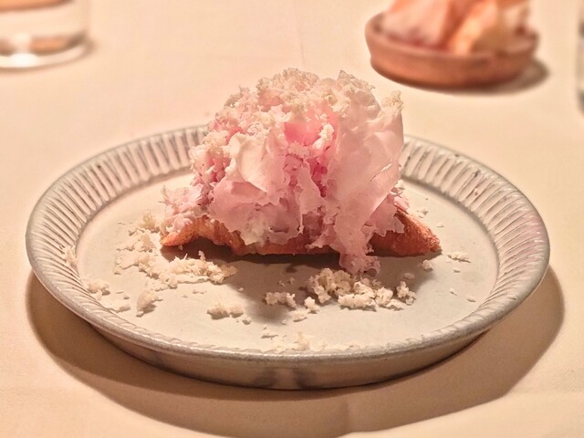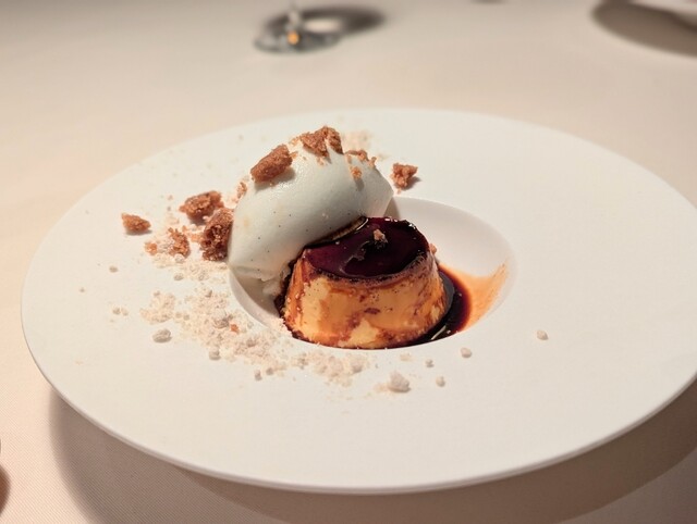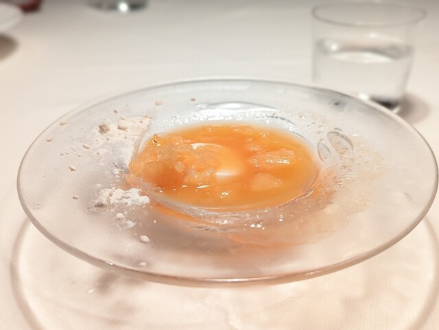 メインは赤牛のモモ。赤身しっかりながら、抜群の火入れで赤身部分はとろけるような感覚。付け合せの百合根もサクサクと心地よい調理。素材に力があるとソースは不要で全く問題ないですね。
