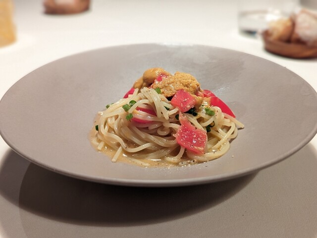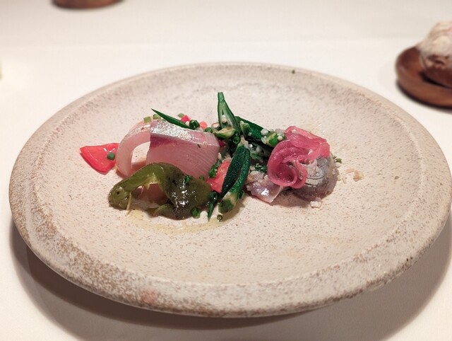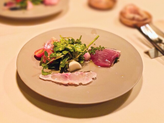今回は手作りのリコッタチーズと、糖度の高いトマトのカプレーゼからスタート。チーズまで作ってしまうのか、このシェフは…手作りというだけあって、フレッシュさが光ります。