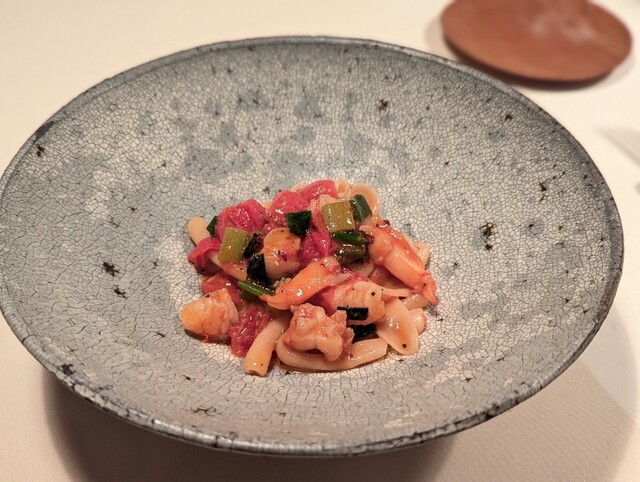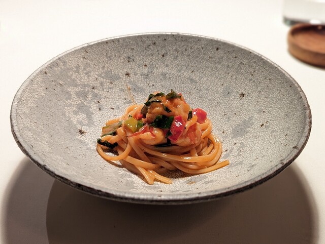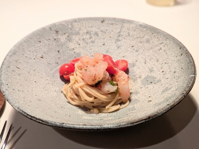 パスタはエビの出汁をきかせたオレッキエッテ。オレッキエッテといえばブロッコリーのソースが定番はありますが、トマトソースにもバッチリ。もちもちとした食感で、エビの旨味に負けないショートパスタです。
