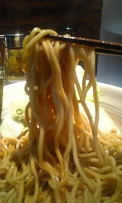 硬くはないが、嬉しい太麺。油で茶色く染みると美味しいサイン。