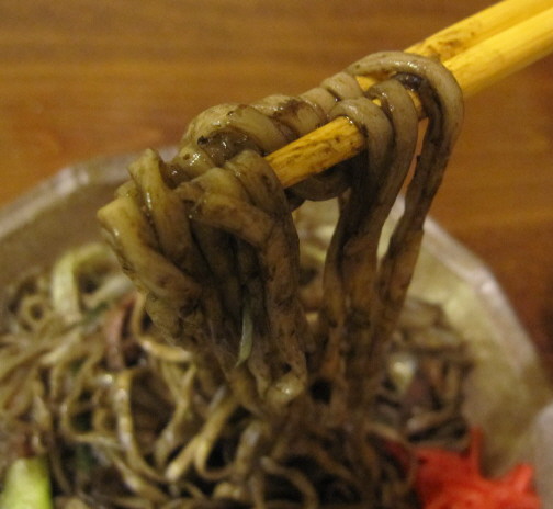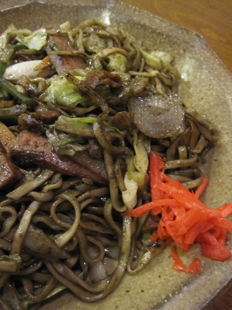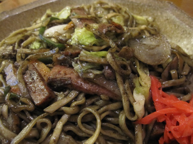 コノ沖縄そばと黒焼きそばソースの相性が抜群。海を感じさせる深い味わいである。また、沖縄らしく、豚肉の替わりにスパムを使っているところも、沖縄風味が効いている。沖縄には無い料理なのだろうが、沖縄を感じる味。
