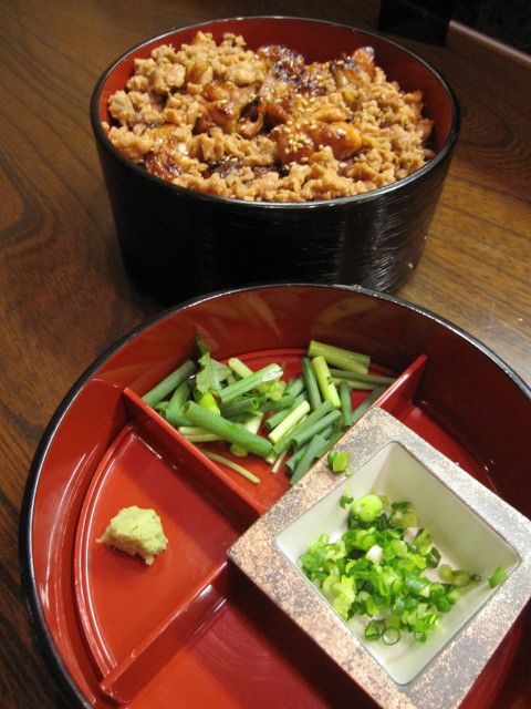 山梨のブランド鶏、臭みの無い”甲州けんみ鶏”を備長炭で一気に焼き、旨味を閉じ込めた逸品。小(¥950)は丼ででてくるが、大は丸いお重。上の段が料理本体。ご飯の上に炭火で適度な焦げ目のついた鶏肉がドーン!まわりの隙間は鶏そぼろでご飯を隠している。下の段にあさつき、ねぎ、わさびの薬味が入っている。