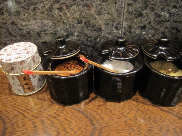 黒七味、七味とうがらし、塩、胡椒