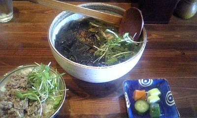 ゴボウがそのまま入っているのではなく、すりおろしたゴボウを片栗粉でとろみをつけてペースト状になったものがたっぷりかかっている。トッピングはほうれん草、かいわれと「いりこの天ぷら(掻き揚げ)」ちょっと苦味があるけど栄養満点!カルシウムを取って冷静に午後の仕事に迎える(笑)。