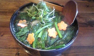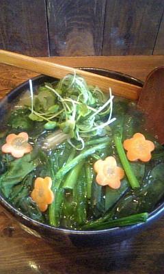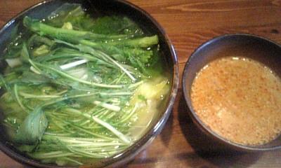 菜の花、水菜、春キャベツ、レタスがたっぷりはいったうどんを、ラー油を入れたピリ辛ゴマつけダレでいただきます。