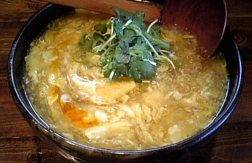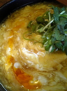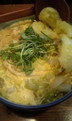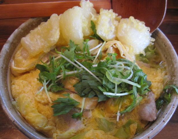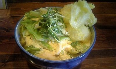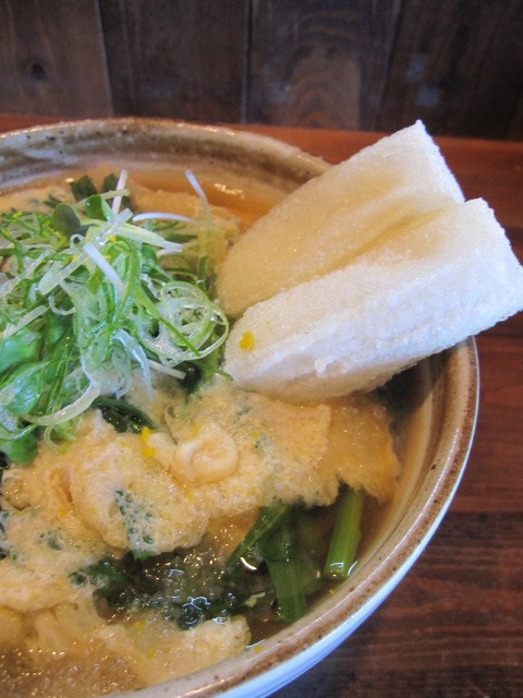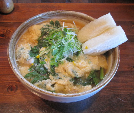 揚げたお餅が一個分はいっているので腹持ちも良く、春菊のはいった”かき玉”うどん。