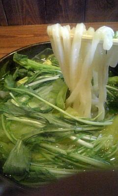 うどん上に水菜、ゆでたキャベツ、ホウレン草がのっていて、野菜もたっぷり取れます。(これ、一将のうどんの特徴)