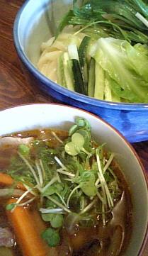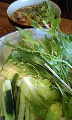 うどんは肉もりと同じ、つけダレはしゃぶしゃぶうどんと同じ。春野菜ほどでは在りませんが、ほうれんそう、きゅうり、水菜などのやさいがはいっています。冷やし中華の具材を意識したのか?