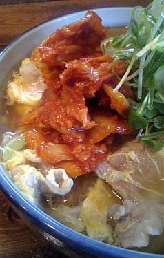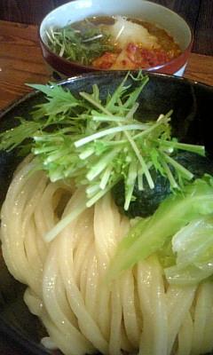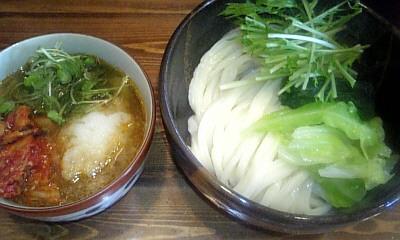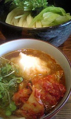 冷たく〆たうどんを豚キムチの入ったつけダレで食べるタイプのうどん。
