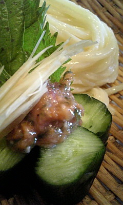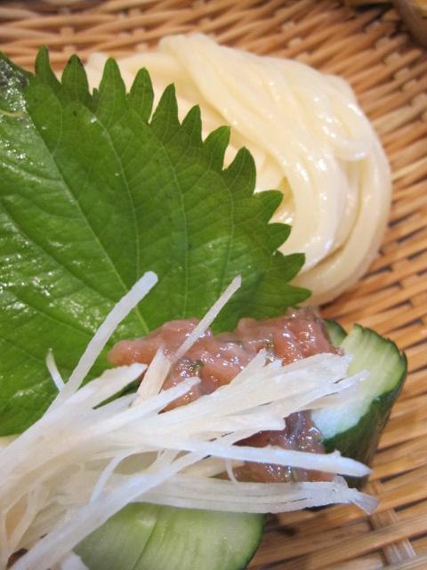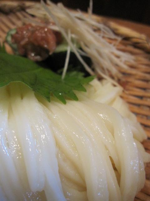 うどんの笊に茗荷、鰹節を練りこんだ梅肉を塗ったキュウリとしそが乗っていて、このきゅうりと一緒に梅肉を食べるか、梅肉をうどんのつゆに入れて食べるかは・・・自由だ〜〜っ!!
