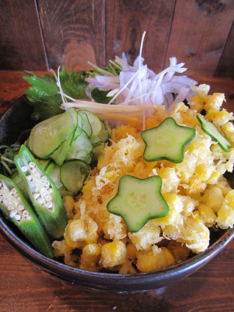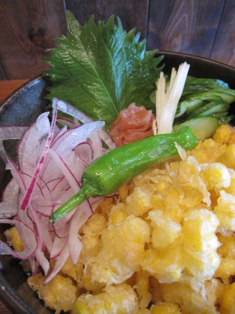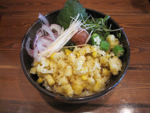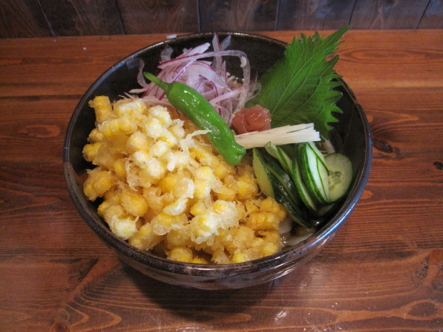 ”玉蜀黍のかき揚げ冷やしうどん” 6〜7月限定!茹でた新鮮なとうもろこしを水溶き小麦粉にまぶして揚げて、ダシをはったうどんに載せたこの店完全オリジナル。