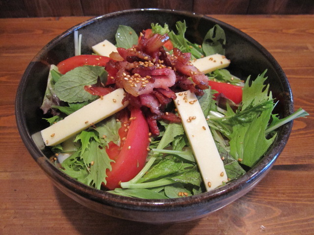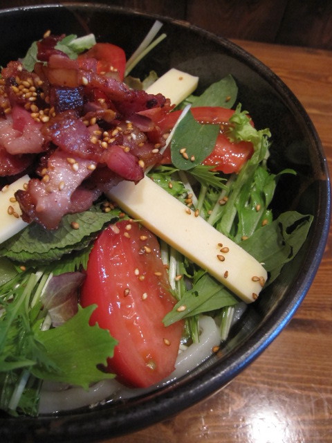 ごまだれ+出汁つゆをはったうどんに、トマト、チーズ、みず菜、カリカリベーコンをトッピング。